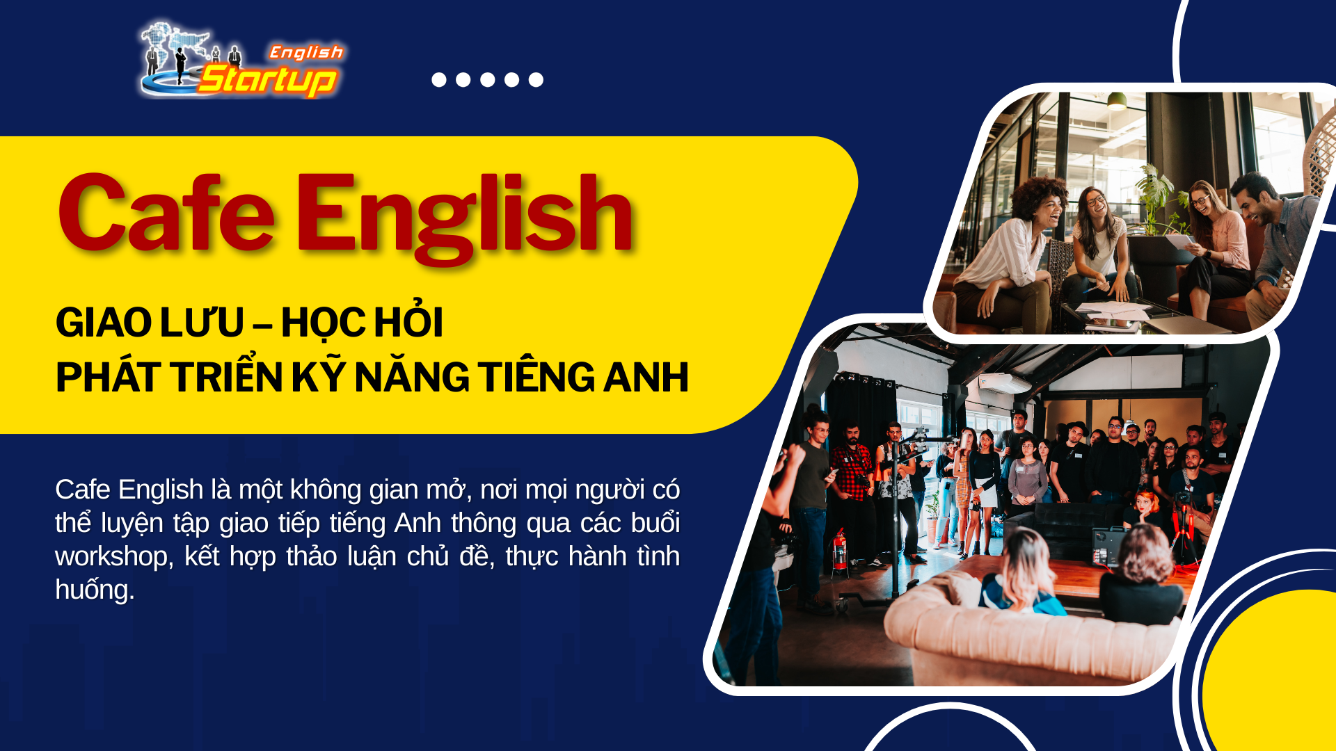 Cafe English là một không gian mở, nơi mọi người có thể luyện tập giao tiếp tiếng Anh thông qua các buổi workshop, kết hợp thảo luận chủ đề, thực hành tình huống. Đặc biệt, không chỉ là tiếng Anh thông thường, mà là tiếng Anh dùng trong kinh doanh, khởi nghiệp, và môi trường quốc tế.