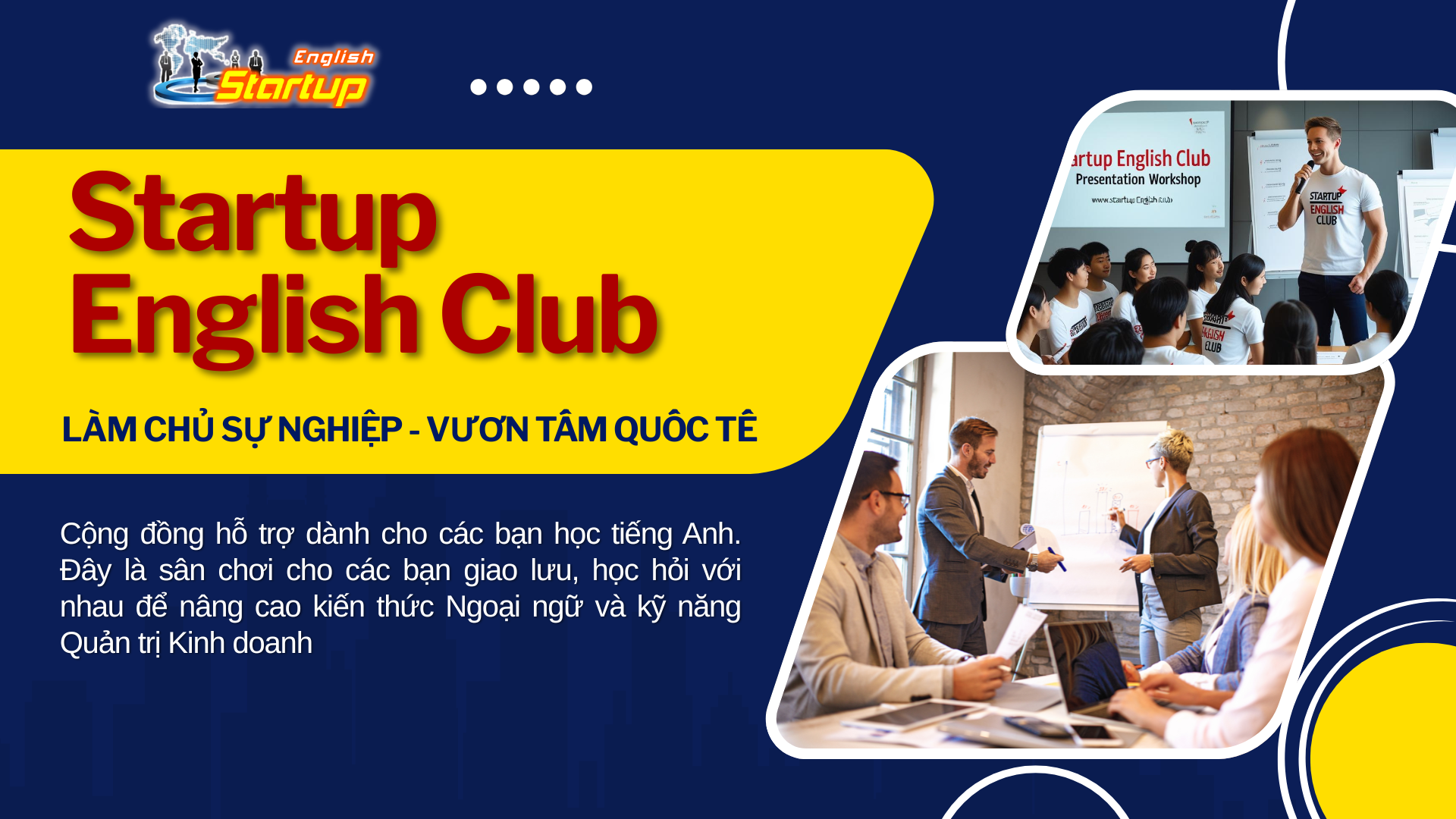 Startup English Club là không gian học tập – kết nối dành cho người đang trên hành trình khởi nghiệp và hướng đến quốc tế. Giúp nâng cao tiếng Anh chuyên ngành kinh doanh, tham gia workshop thực tế.