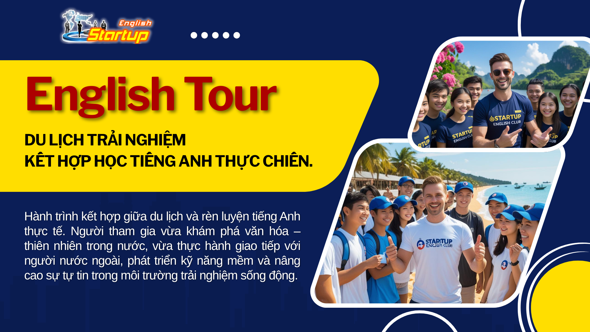 English Tour Discovery - là hành trình kết hợp giữa du lịch và rèn luyện tiếng Anh thực tế. Người tham gia vừa khám phá văn hóa – thiên nhiên trong nước, vừa thực hành giao tiếp với người nước ngoài, phát triển kỹ năng mềm và nâng cao sự tự tin trong môi trường trải nghiệm sống động.